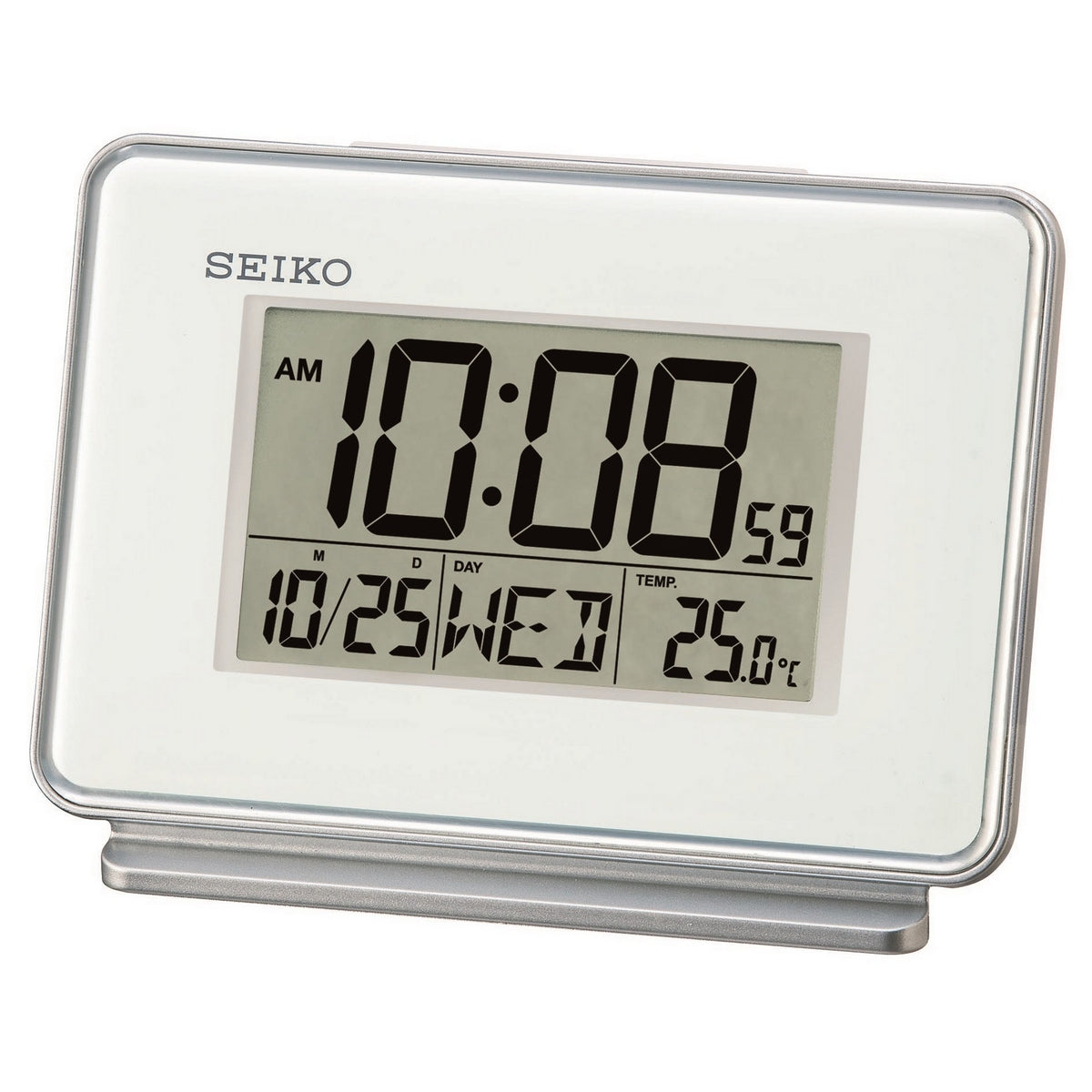 SEIKO WHITE DIGITAL ALARM CLOCKDual Alarm/Beep Alarm Snooze Light Calendar Thermometer Daylight Saving Time Automatic alarm stop function Battery: AA x 2