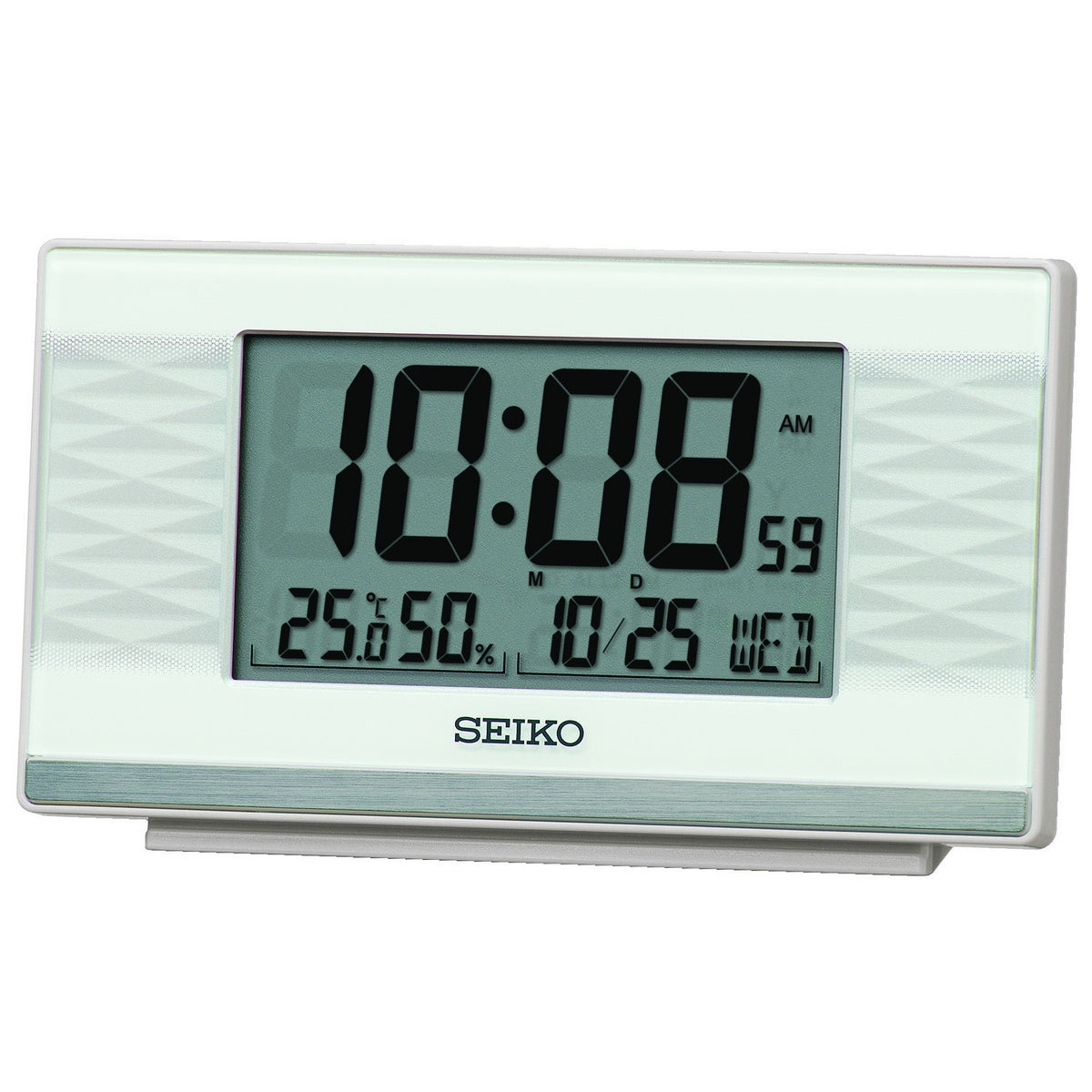SEIKO DIGITAL BEDSIDE SILVER ALARM CLOCKDual ascending beep alarm, Automatic alarm stop(5 minutes) Snooze, Calendar M Day/Day M, Thermometer, Hygrometer, Daylight Saving Time, Light