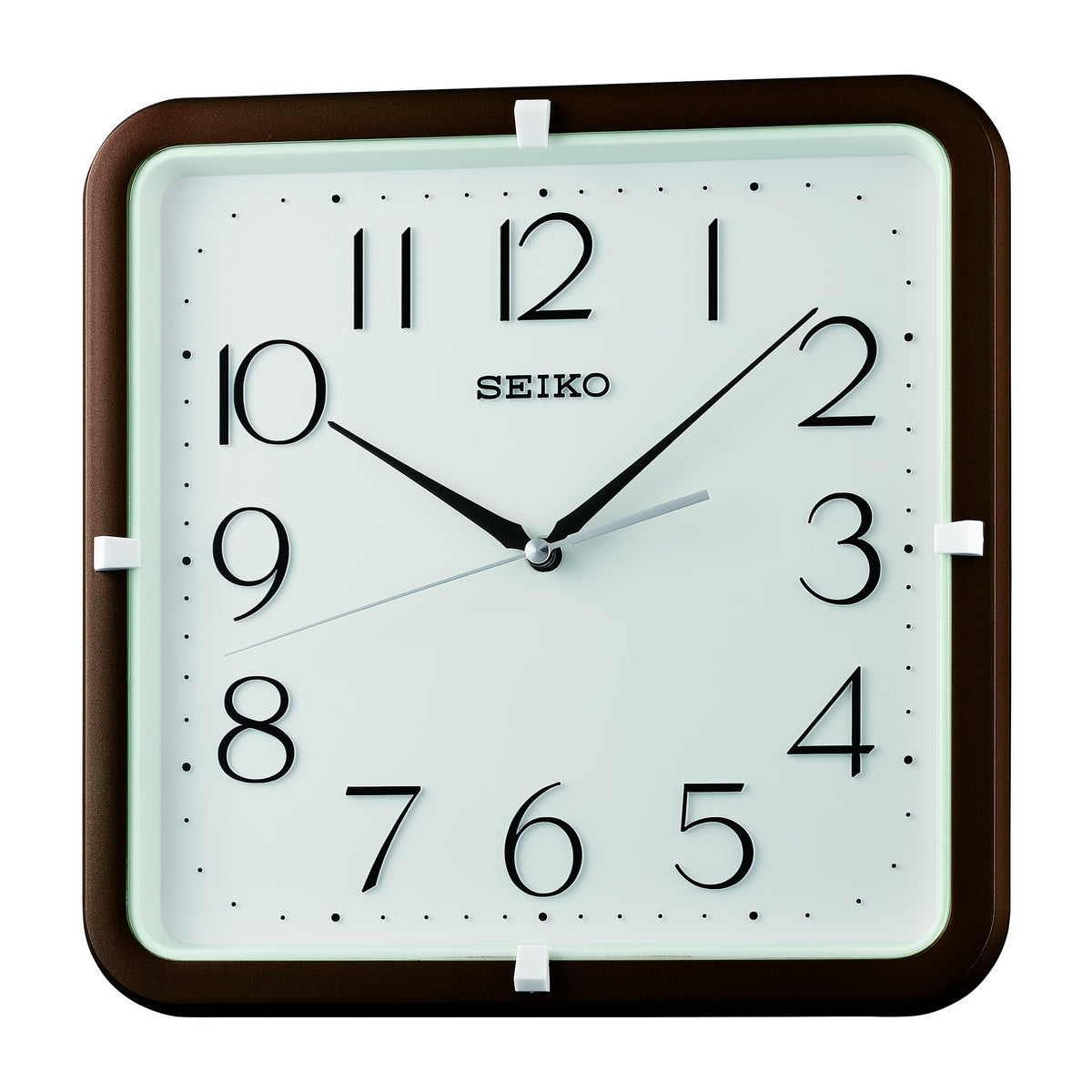 SEIKO QUARTZ WHITE DIAL WALL CLOCKSilent analog wall clock with smooth movement 12-position Arabic numeral markers High-quality plastic case Battery: AA x 1 Case size: 28 x 28 x 4 cm.