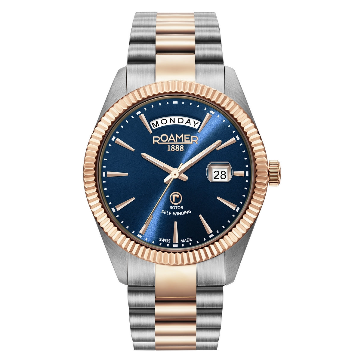 roamer primeline daydate swiss made automatic stp4-13 3 hands - day & date ss iprosegold two tone mechanical wrist-watch - analog - self winding