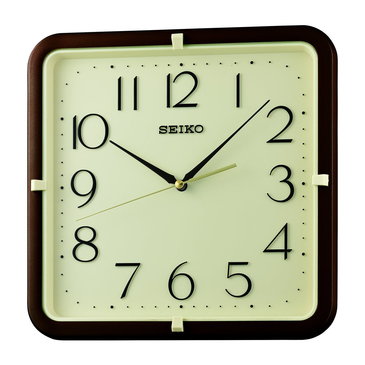 SEIKO QUARTZ CREAM DIAL WALL CLOCKSilent analog wall clock with smooth movement 12-position Arabic numeral markers High-quality plastic case Battery: AA x 1 Case size: 28 x 28 x 4 cm.